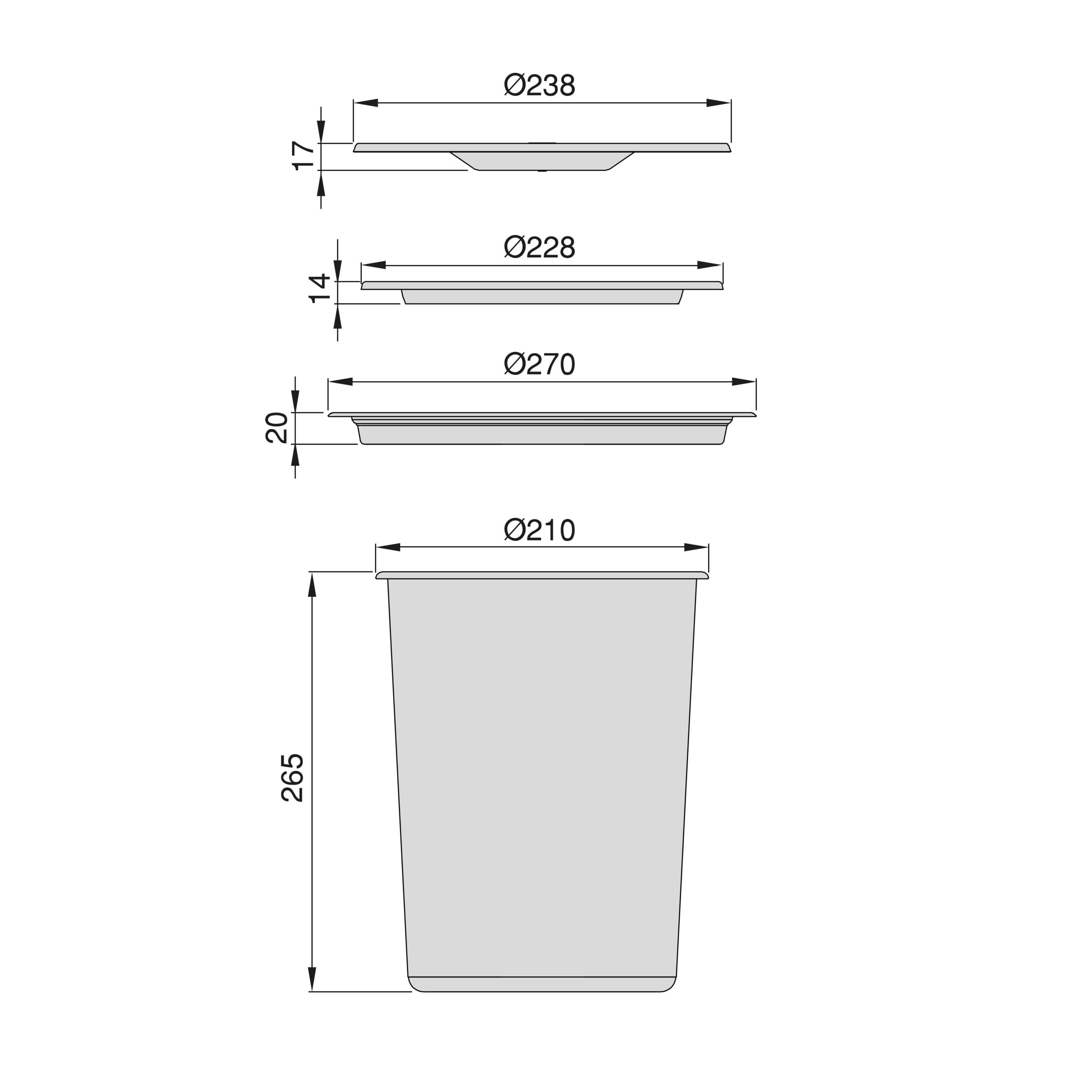 270 mm, da die Höhe des Eimers 265 mm beträgt.