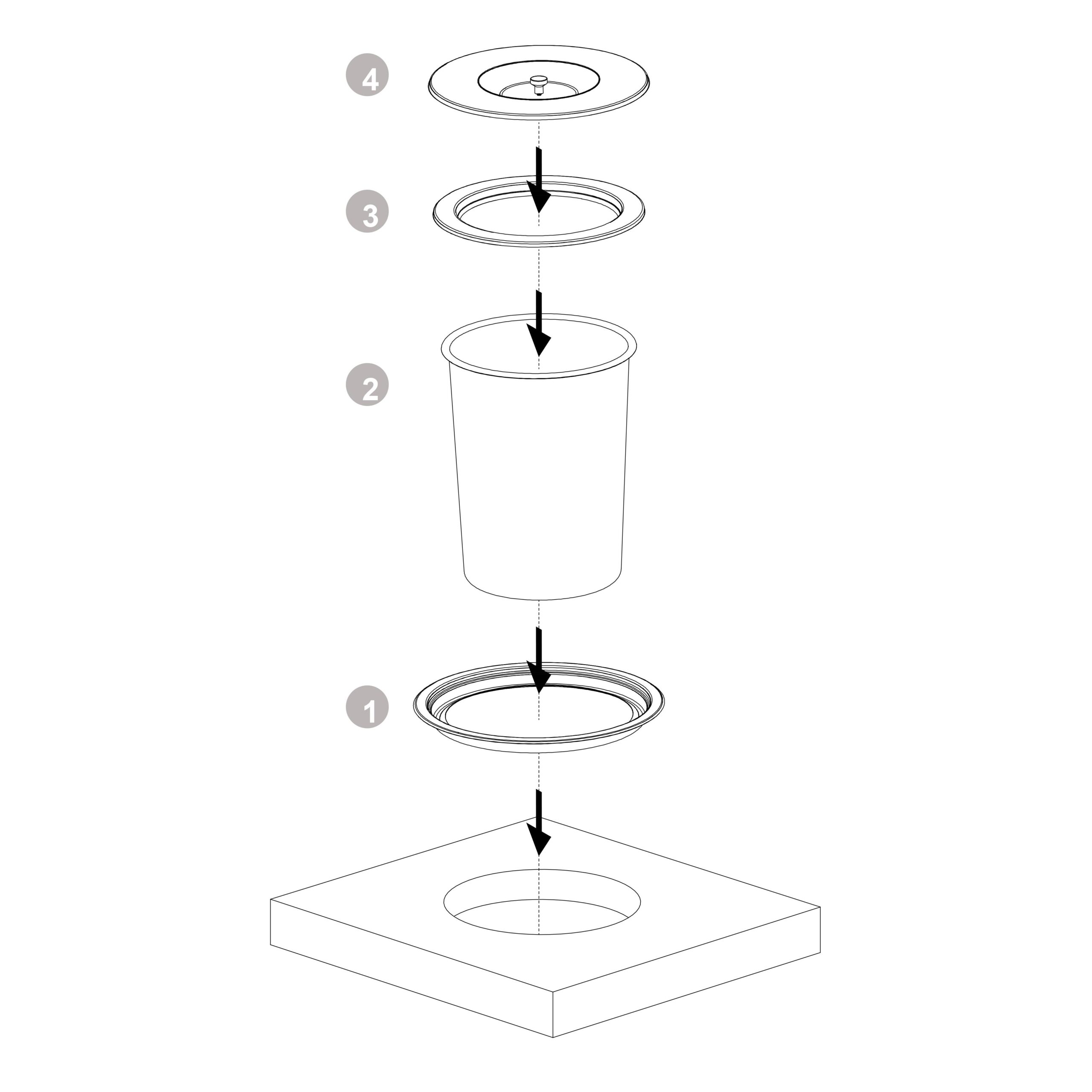 Das Paket enthält einen 8-Liter-Behälter, den Deckel, zwei Ringe und eine Montageanleitung.