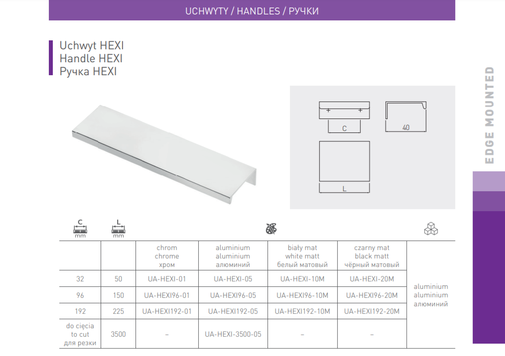 Nekonvencionalna, moderna, dizajnirana prema najnovijim trendovima u industriji namještaja, HEXI rubna ručka izrađena je od gracioznog materijala a to je aluminij. Ručka daje jedinstvenu liniju kada se koristi na prednjoj strani ladice ili ormarića, naglašavajući njegov izgled i oblik. HEXI je dostupan u četiri varijante boja: krom-01, aluminij-05, crna mat-20M, bijela mat-10M i u tri razmaka rupa: 32, 96, 192 mm. Širina drške je L-40mm. Pažljivo skošenje ruba ručke daje osjećaj visoke kvalitete izrade i povjerenja. Zahvaljujući oblikovanoj ručki, ručka unosi moderan dizajn u svaki interijer.